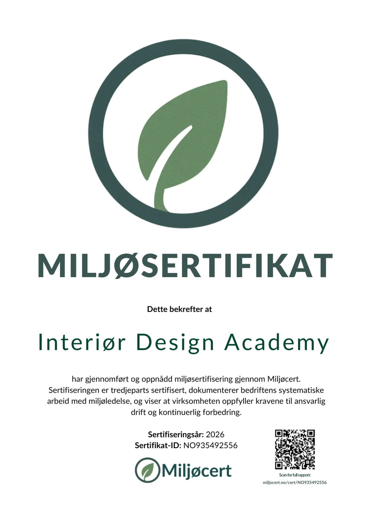 Interiør Design Academy er sertifisert innen miljøledelse gjennom Miljøcert.